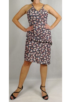 Tubino con piccolo scollo a V e spallini sottili. Il taglio all'altezza del fianco sottolineato da piccola rouche spezza il movimento minimizzando eventuali difetti di larghezza fianchi. Fondo asimmetrico e spacco laterale