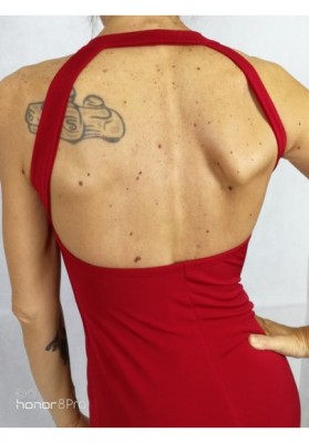 Molto particolare l'abito a tubino con scollo all'americana, il profondo scollo quadrato valorizza il decoltè. Lunghezza al ginocchio e spacco dietro.